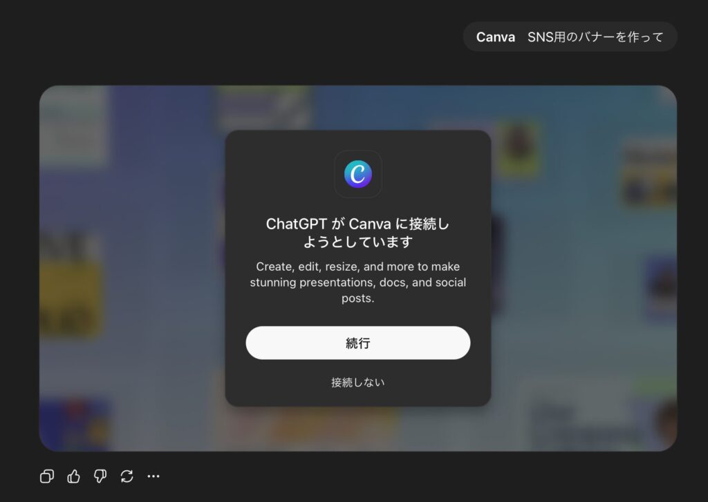 たとえば「Canva、SNS用のバナーを作って」と入力すると、Canvaのデザイン画面がそのままChatGPT内に表示され、テンプレート選択や編集などの操作を会話しながら進められます。